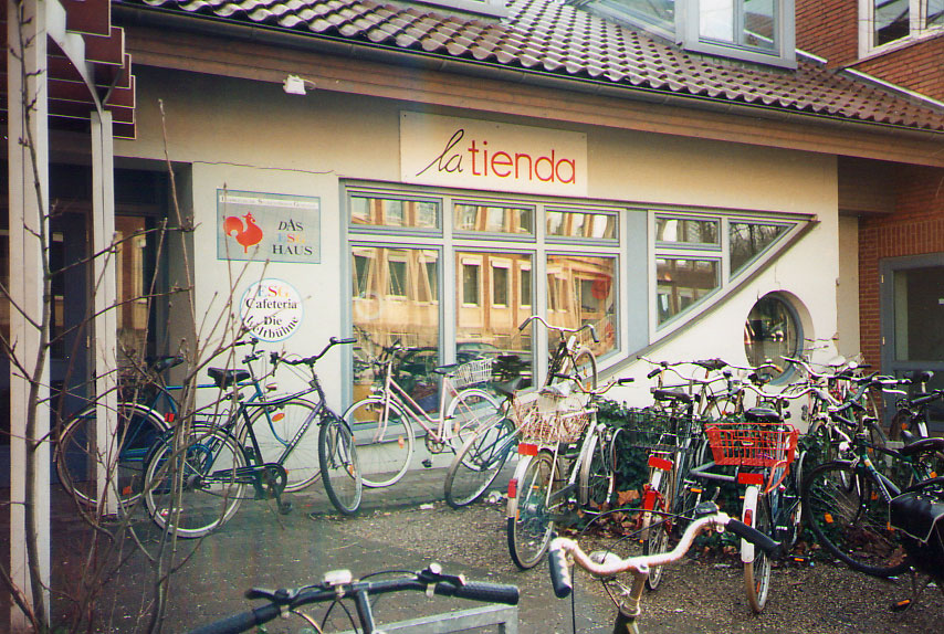 Der 9. Juni gilt als Geburtstag von la tienda. Die Initiative für Eine Welt erhielt von der Katholischen Studierenden Gemeinde (KSG) die Möglichkeit an der Frauenstraße 7 den vorderen Teil eines Gruppenraumes mit Schaufenster tagsüber mietfrei zu nutzen. Zwei Regale mit Rollverschluss und ein Schreibtisch konnten aufgestellt werden, so dass nun regelmäßig "der Laden" geöffnet werden konnte. Abends diente der Raum weiter für Veranstaltungen. Jetzt wurden mehr Leute gebraucht, die regelmäßige Ladenschichten (1,5 bis 2 Std.) übernehmen konnten.